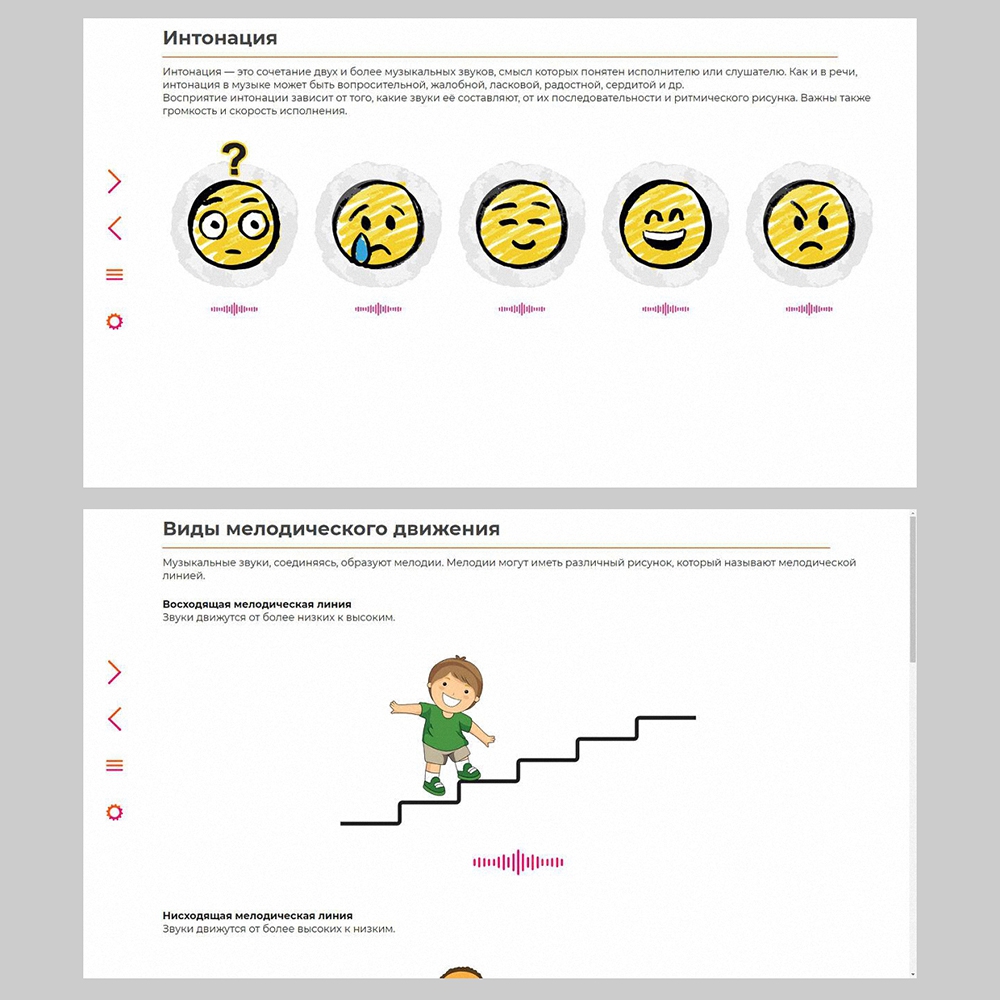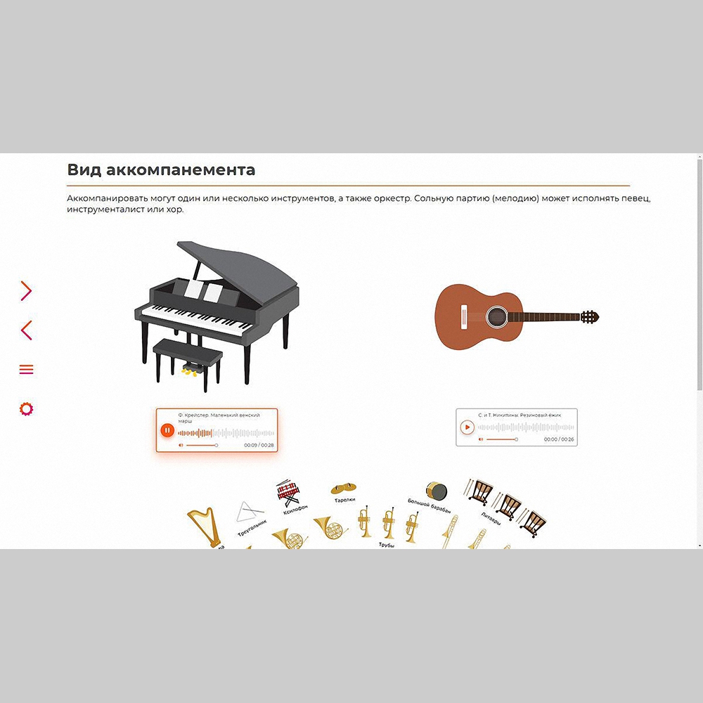 - обучающий материал (тексты, ноты, иллюстрации, аудио- и видеофрагменты);