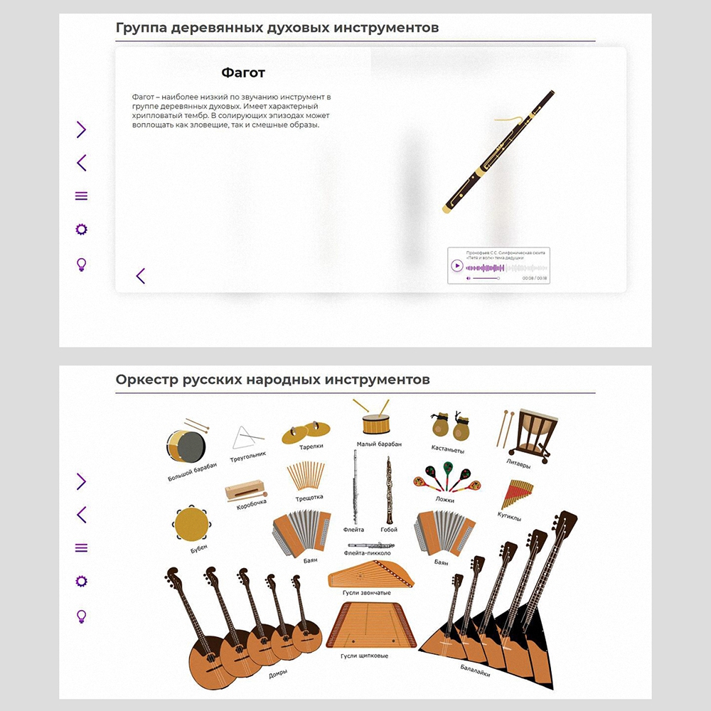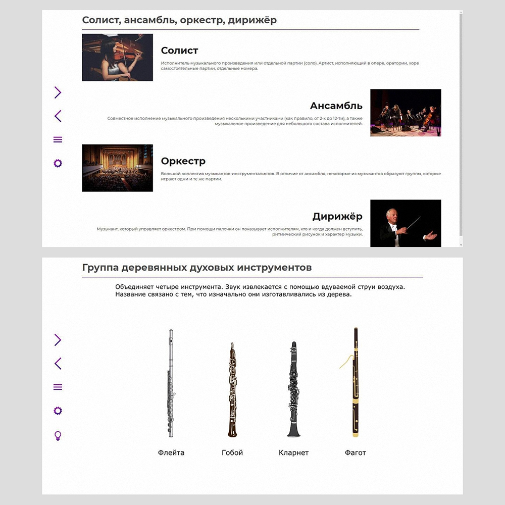 - обучающий материал (тексты, ноты, иллюстрации, аудио- и видеофрагменты);
