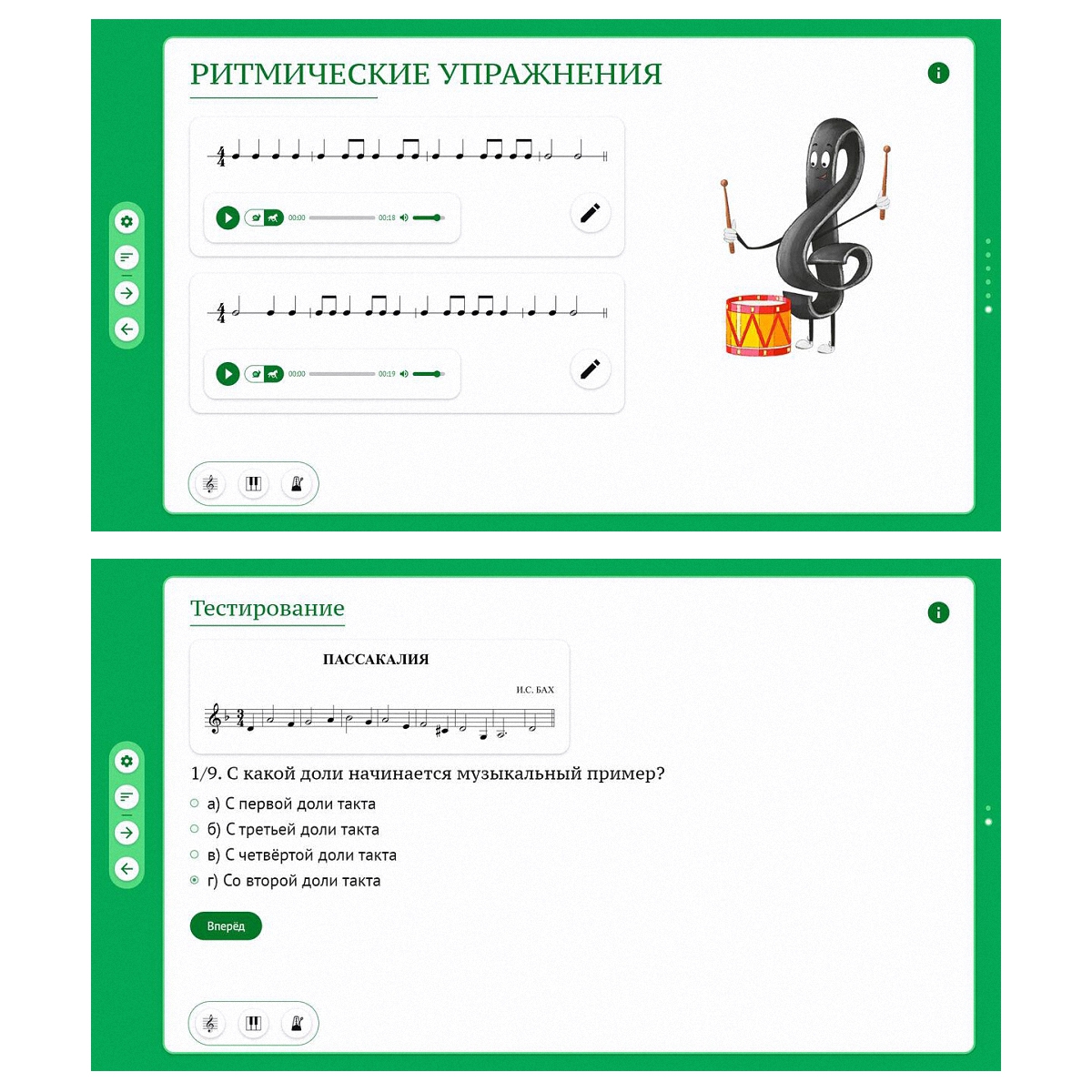 - интерактивные элементы (нотный стан, клавиатура, метроном) и задания;