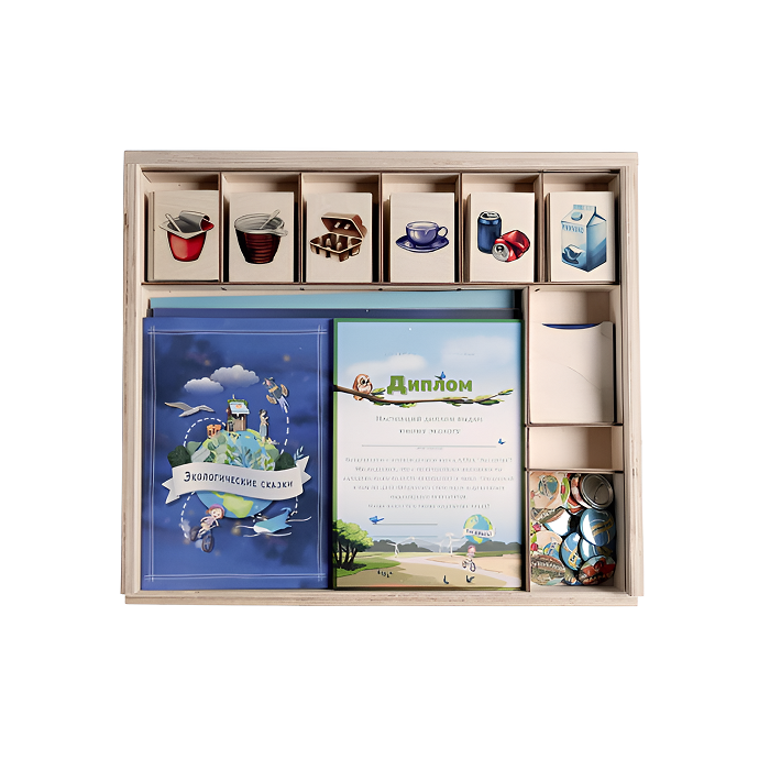 Методический интерактивный комплекс «Экология» — это художественно оформленная сенсорная панель с программным обеспечением, а также мотивационные значки и дипломы «Юного эколога», сборник экологических авторских сказок, тематические плакаты и комплект деревянных контейнеров, комплект игральных карточек для «сортировки мусора», карточки для проведения викторины.