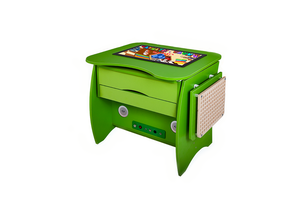 Отличительной особенностью логопедической парты является возможность изменения высоты парты и положения сенсорного монитора с горизонтали в вертикаль. Также, логопедический стол оснащен дополнительным модулем с дидактической мозаикой.