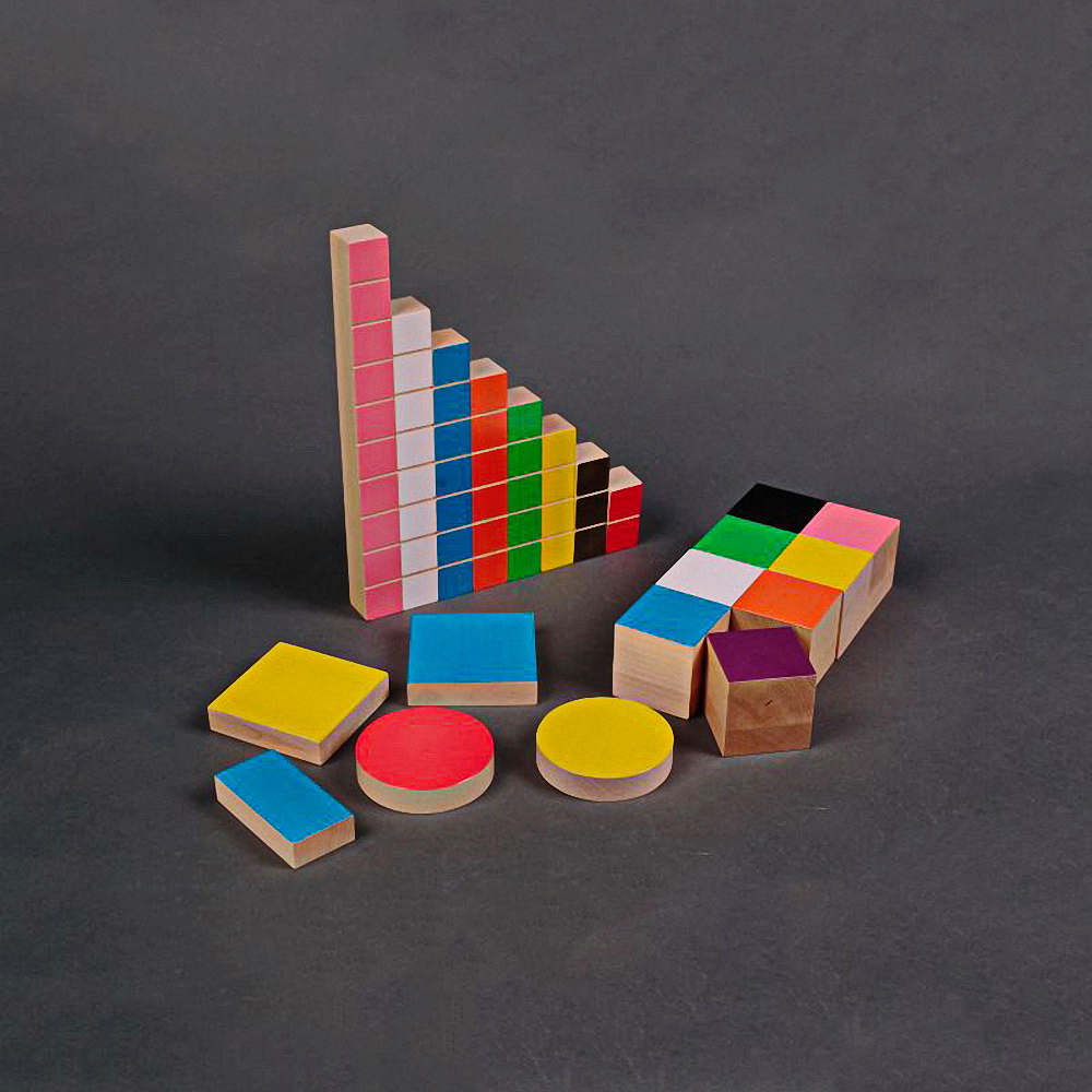 В комплект дидактических материалов входят цветные геометрические фигуры с вертикальными блоками, яркие пластиковые коврики, пазлы, счетные рамки и занимательные карточки с рисунками.