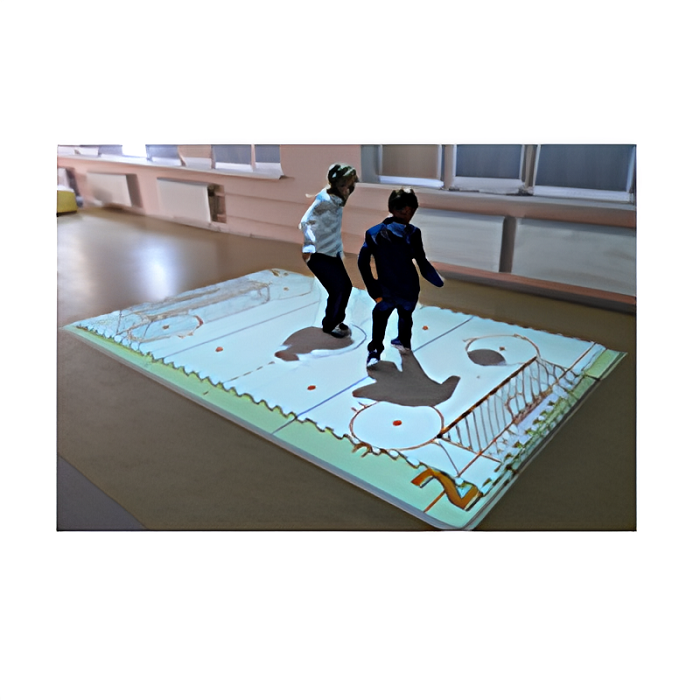 Оборудование предназначено для проецирования изображения на поверхность пола, для взаимодействия с ним пользователей. Пользователи касанием с проекцией взаимодействуют с играми специализированного программного обеспечения. Комплект поставки состоит из блока интерактивного пола, мягкого напольного покрытия белого цвета, клавиатуры и мыши, методического пособия по развивающим играм. Отличительная особенность данной модели – это большой размер проекции и точная работа датчика детекции.