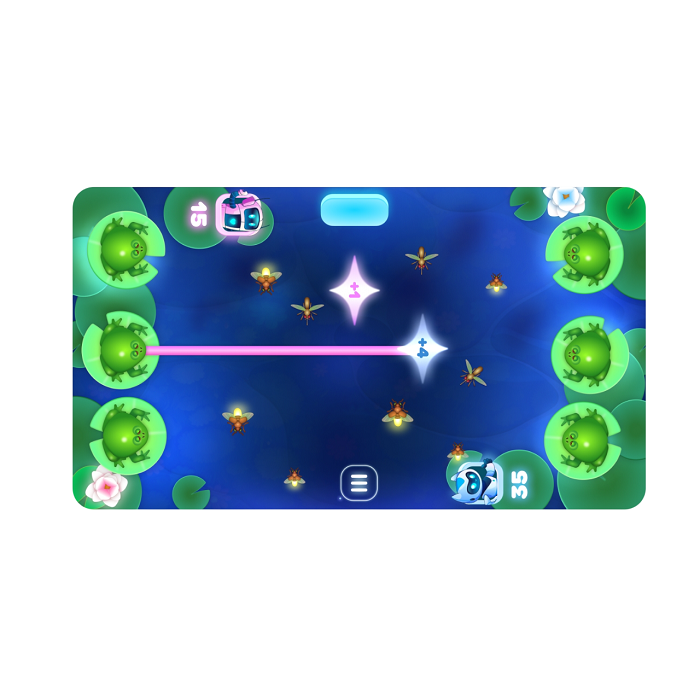 Одновременно играют два человека. Цель игры — накормить своих лягушек. Для этого надо, ориентируясь на движущихся насекомых в центре площадки, нажать на ближайшую лягушку на своем игровом поле быстрее соперника и заработать больше баллов.