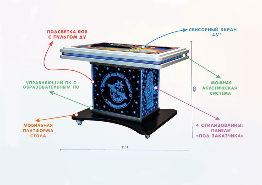 Антивандальная поверхность сенсорного 43 дюймового экрана привлекает качественным и четким изображением, высокопроизводительный ПК быстро воспроизведет весь загруженный контент и программы, увеличенная мощность динамиков позволит услышать звуковую информацию даже из дальних углов образовательной аудитории, а регулируемая подсветка RGB акцентирует внимание на стилизованных фасадах стола, изображения на которых наносятся по согласованию (это могут быть гербы страны, региона, города или учреждения или любые другие изображения).