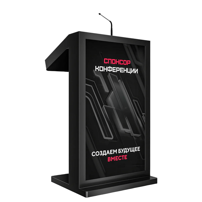 Мультимедийное решение, которое позволяет не только ярко выступить на большую аудиторию, с отображением презентационного материала, но и эффектно продемонстрировать рекламную информацию о компании, предлагаемых товарах / услугах, спикере, на большом внешнем дисплее трибуны. Модель Double 23,8" оснащена мощным микрофоном, сенсорным дисплеем для спикера, а также большим внешним дисплеем для рекламного контента и набором разъемов для подключения дополнительной техники. Такая трибуна станет прекрасным помощником на конференциях, выставках, спортивных мероприятиях или других мероприятиях, где требуется визуальная поддержка презентаций и общение с аудиторией.