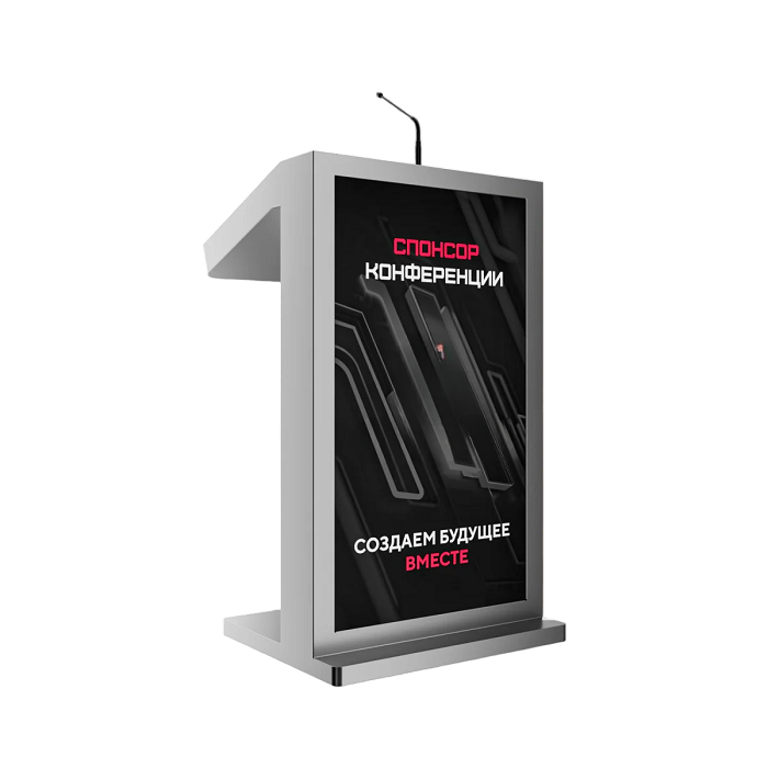 Мультимедийное решение, которое позволяет не только ярко выступить на большую аудиторию, с отображением презентационного материала, но и эффектно продемонстрировать рекламную информацию о компании, предлагаемых товарах / услугах, спикере, на большом внешнем дисплее трибуны. Модель Double 27" оснащена мощным микрофоном, сенсорным дисплеем для спикера, а также большим внешним дисплеем для рекламного контента и набором разъемов для подключения дополнительной техники. Такая трибуна станет прекрасным помощником на конференциях, выставках, спортивных мероприятиях или других мероприятиях, где требуется визуальная поддержка презентаций и общение с аудиторией.