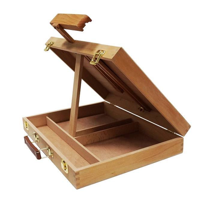Удобный настольный этюдник сочетает в себе функции мольберта и ящика для хранения кистей и красок. За счет того, что регулируется как верхний бегунок, так и нижняя планка, этот этюдник легко удерживает холсты больших размеров. Выполнен из бука, покрыт лаком.