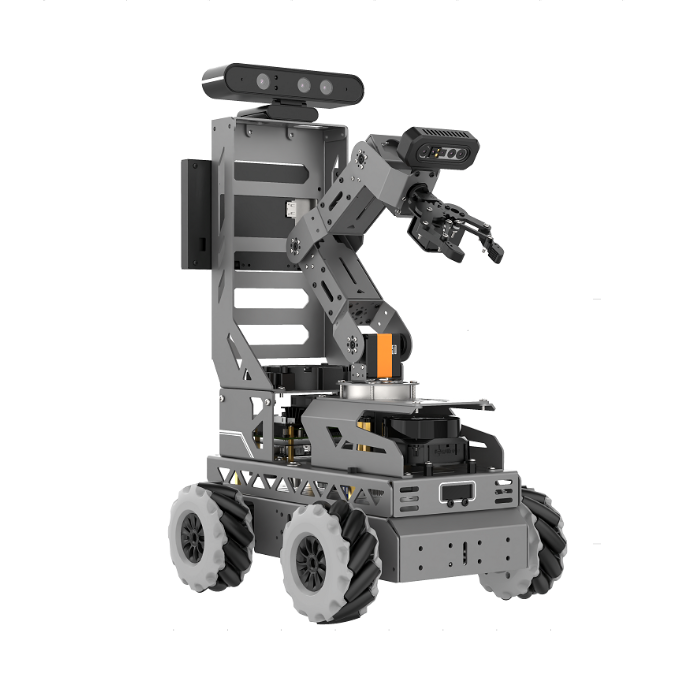 Это профессиональная роботизированная платформа для обучения и разработки ROS, работающая на базе NVIDIA Jetson Nano B01. Благодаря 4 всенаправленным механическим колесам возможно движение на 360° без поворотов, 5 осевой манипулятор с камерой технического зрения может осуществлять захват, сортировку и перемещение объектов, Оснащен лидаром и поддерживает картографическую навигацию SLAM, 6-канальный микрофонный массив дальнего действия и динамики поддерживают позиционирование источника звука, управление распознаванием голоса, голосовую навигацию, оснащен камерой глубины и может эффективно воспринимать изменения окружающей среды, что позволяет интеллектуально взаимодействовать с людьми