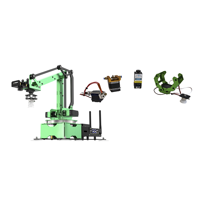 Четырёхосевой учебный робот- манипулятор с модульными сменными насадками на базе NVIDIA Jetson Nano, использует роботизированную систему ROS и поддерживает программирование на языках C++, Python, Java, Java Script и др. включает в себя ресурсный набор для расширения возможностей изучения манипуляторной робототехники, позволяя так же изучить 2д и 3д моделирование, аддитивные технологии и технологию лазерной резки. Гироскоп используется в четырехосевом манипуляторе рычажного типа для измерения угловой скорости каждого из рычагов. Это позволяет определить положение и ориентацию манипулятора в пространстве. Полученные данные ориентации могут быть использованы для контроля движения манипулятора, обеспечения его стабильности и точности выполнения задач. Сменный лазерный модуль предназначен для добавления функциональности к манипулятору. Он позволяет выполнять точные и высококачественные операции по резке и гравировке различных материалов, таких как дерево, пластик, ткань, кожа, акрил и бумага. Роботизированный манипулятор с открытым исходным кодом, разработан на основе NVIDIA Jetson Nano. У него есть широкоугольная камера высокой четкости и интеллектуальные адресные сервоприводы. Он использует роботизированную систему ROS и поддерживает программирование на Python, С++, С# и др. Благодаря глубокому обучению и компьютерному зрению, способен выполнять множество задач, таких как распознавание цвета, сортировка мусора, распознавание жестов, распознавание лиц и определение наличия масок. С помощью мобильного приложения для Android/iOS, ПК, мыши и пульта дистанционного управления PS2 вы сможете управлять им легко и просто. Использует алгоритм обратной кинематики, обеспечивающий точное отслеживание, захват, сортировку и укладку цели. Он также предоставляет подробный анализ обратной кинематики, модели DH и предлагает исходный код для функции обратной кинематики. Благодаря открытому коду предустановленных программ, позволяет вам легко изучить компьютерное зрение роботов, обработку изображений, кинематику и другие аспекты робототехники, а также быстро воплотить различные творческие проекты в области искусственного интеллекта.
