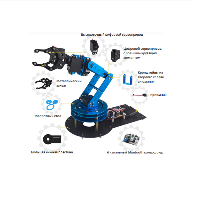 Роботизированный манипулятор с 6 степенями свободы. Детали выполнены из прочного алюминиевого сплава. В комплекте есть джойстик и устройство захвата. Набор подойдет для одновременной работы одного-двух учеников в возрасте от 12 лет.