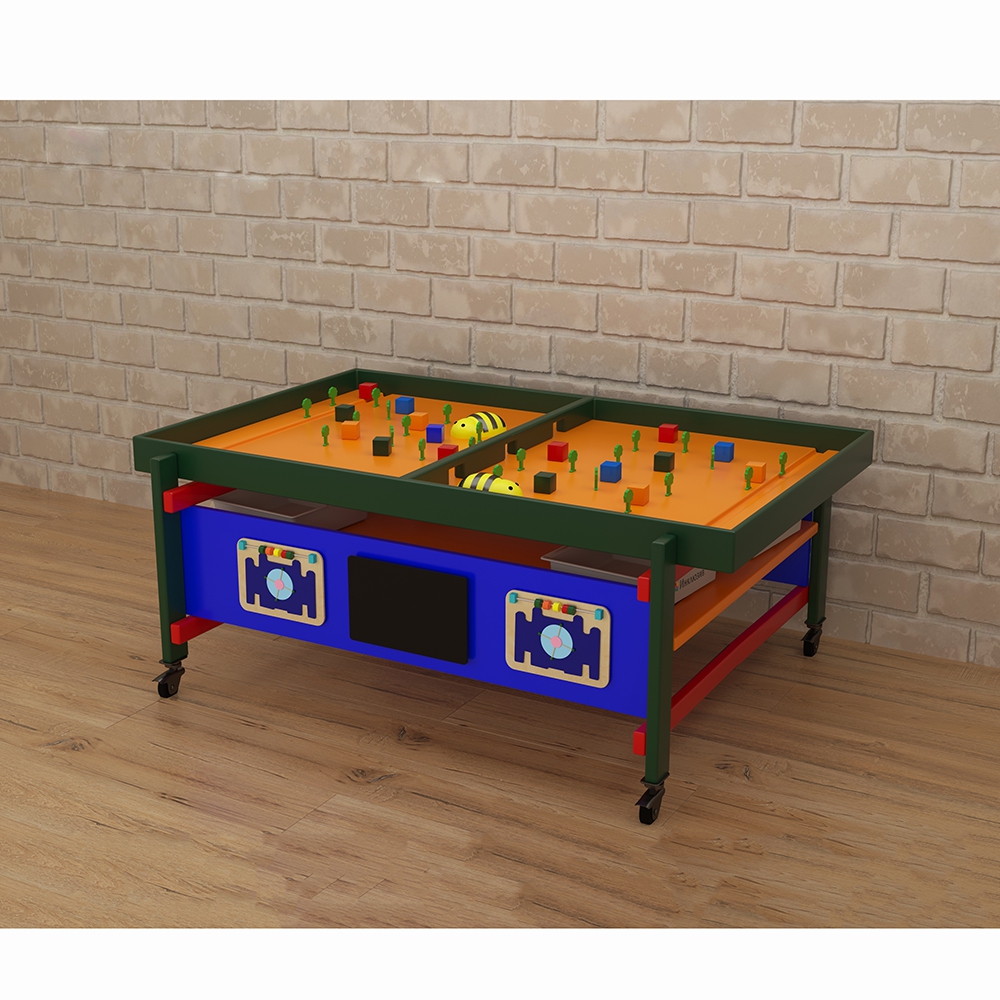 STEAM-стол “Весёлые пчёлки” выполнен в сине-зелёной гамме, а столешница имеет красивый оранжевый цвет. Однозначное положительное отличие этого игрового стола от обычных столов для детского обучения – продуманное использование буквально каждого сантиметра имеющихся площадей – на столешнице расположено сразу 2 изолированных друг от друга пр помощи бортиков ландшафтные локации с игровыми фигурками, под столешницей имеются полки разных размеров для хранения развивающих наборов; всё это делает его необходимым элементом оснащения пространства для занятий с детьми. Столешница обладает широким игровым потенциалом – используя методические рекомендации и разнообразнве игровые наборы, можно многократно увеличить диапазон её использования. Стол оснащён колёсиками – его можно перемещать без особых усилий, не повреждая напольное покрытие. STEAM столы широко используются дошкольными педагогами и некоторыми узкими детскими специалистами – логопед, дефектолог – для групповых и индивидуальных занятий с детьми дошкольного и младшего школьного возраста.