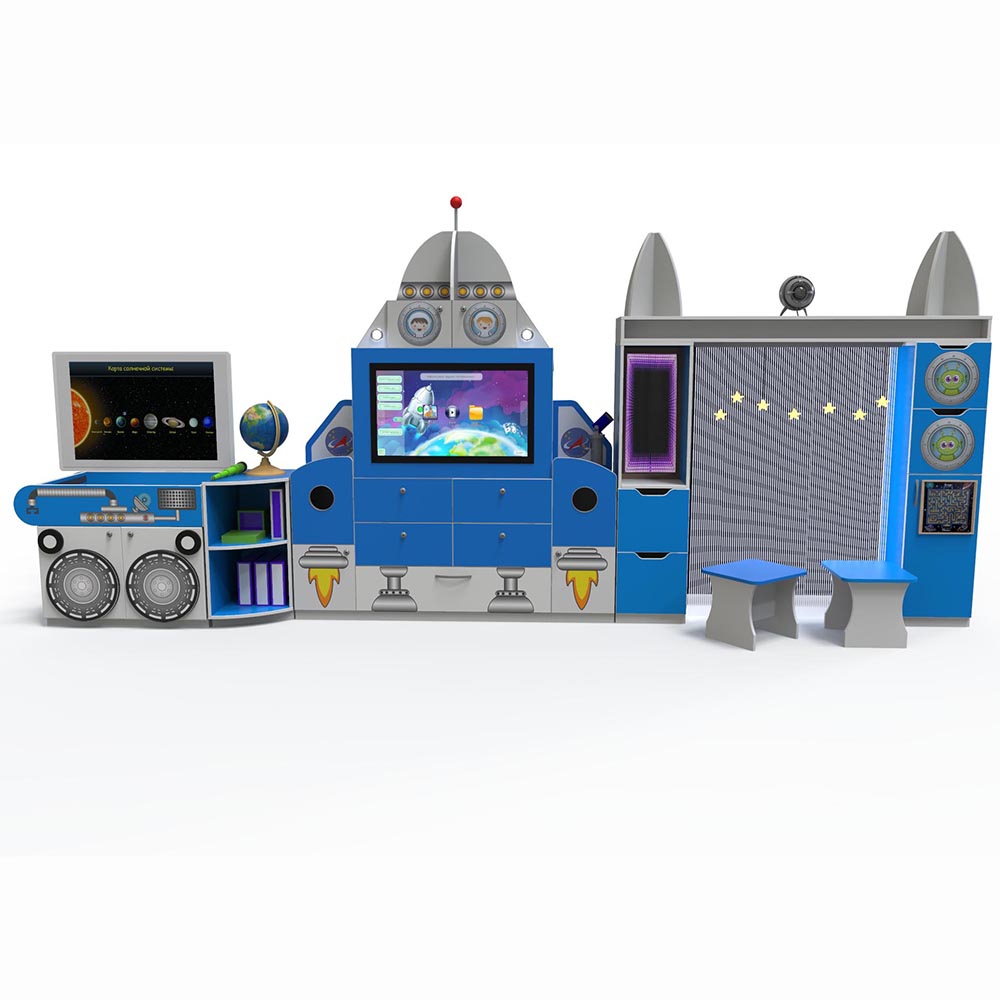Исполнен в виде полноценной тематической мебели, состоящей из нескольких отдельных модулей со встроенной интерактивной системой, а также с полками и ящичками. Каждый модуль с прямым обучающим назначением. Комплекс с продуманным индивидуальным дизайном «Логопедический космодром». Это заинтересует ребенка и вовлечет в рабочий процесс.
