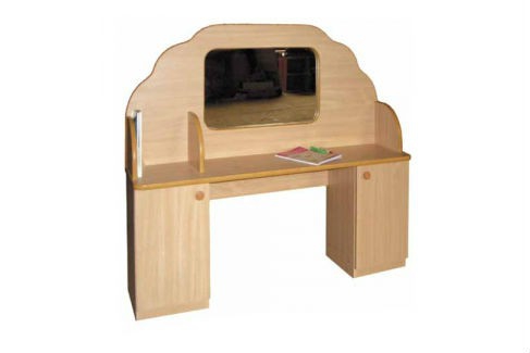 Уголок с зеркалом и двумя тумбами. Столешница заменяющая стол, разделена бортиком, на ней можно разложить необходимые для занятий пособия, поставить карандаши, ручки, книги. Красоту уголку придают полукруглые бортики и задняя рельефная стенка.