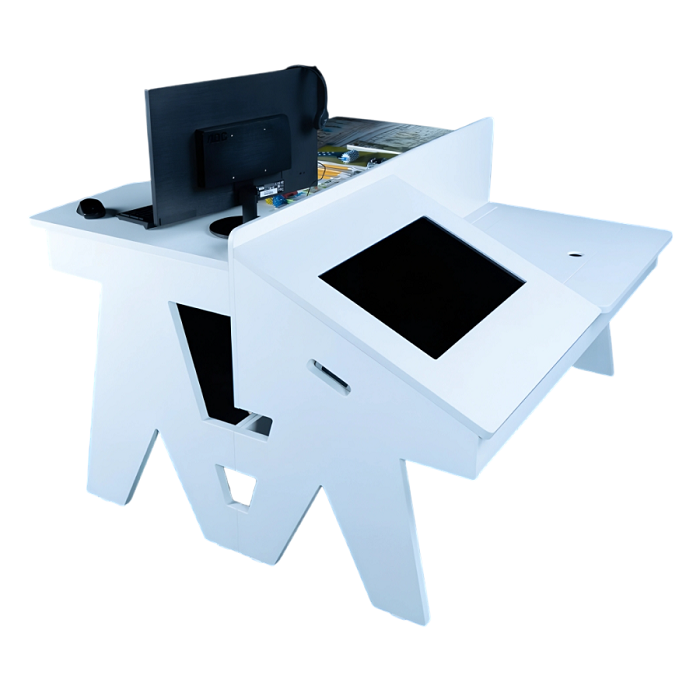 Рациональное оснащение. В комплектацию стола входит не только рабочее место специалиста с компьютером, но и детский стол со встроенной сенсорной панелью, акриловое зеркало, отсек для песочной терапии и полная тумба методических пособий и лого-инвентаря. Всё это обеспечивает максимальный комфорт и эффективность работы.