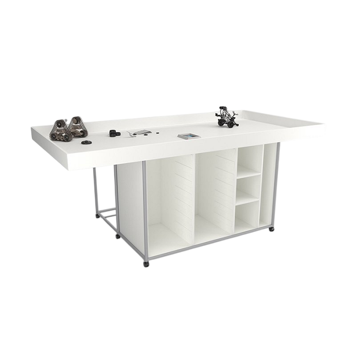 Стол для конструирования и робототехники с полками и местами хранения.