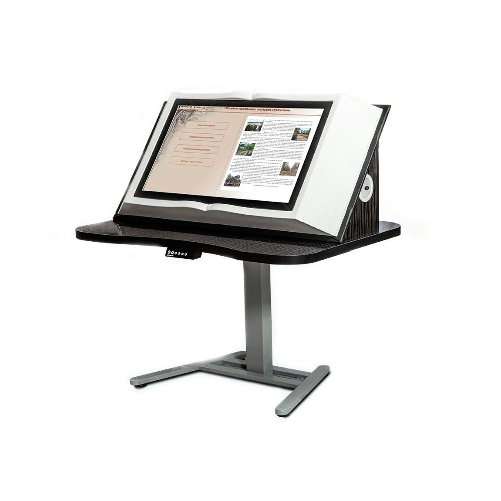 Интерактивная книга является единой мультимедийной сенсорной системой в стилизованном корпусе. Верхняя часть интерактивной книги представляет собой антивандальный сенсорный монитор, заключенный в декоративный корпус, выполненный в виде развернутой книги. Имеется возможность выбора диагонали сенсорной книги: 27”, 32”, 43” и 55”. Нижняя часть сенсорной книги представляет собой электронный подъемный механизм с удобным управлением и возможностью программирования высоты изделия. Интерактивный монитор расположен под оптимальным углом для удобства пользователя.