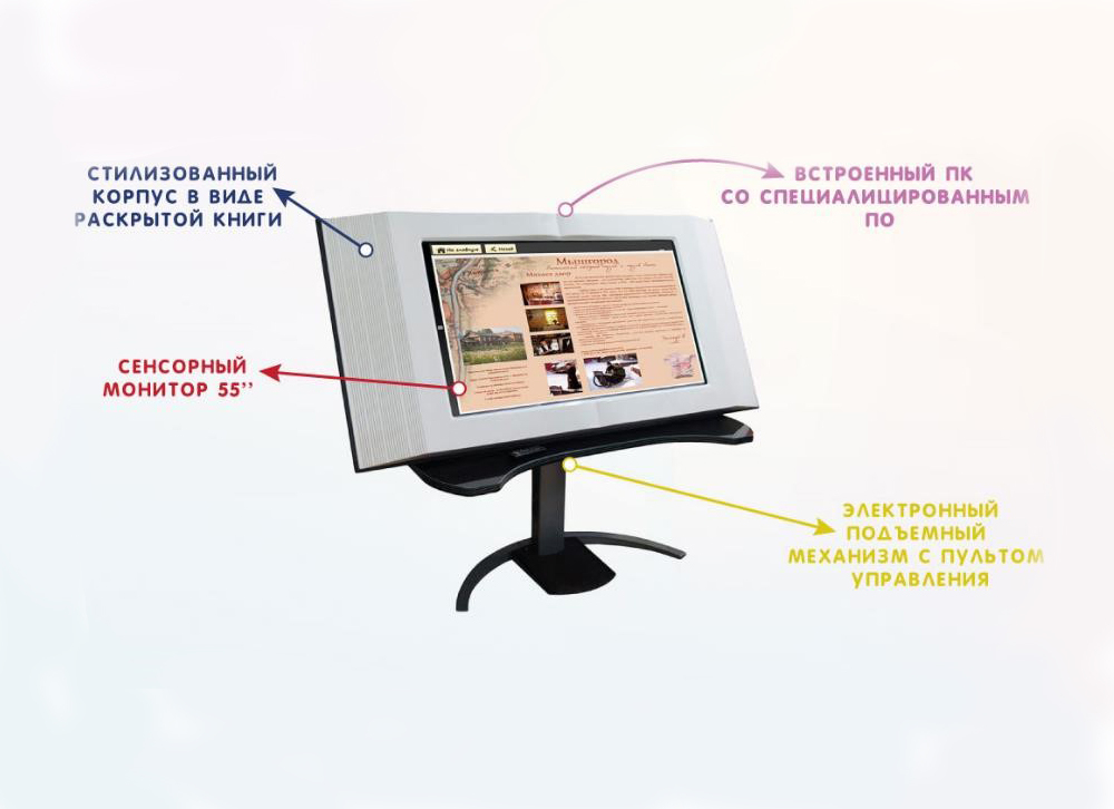 Интерактивная книга является единой мультимедийной сенсорной системой в стилизованном корпусе. Верхняя часть интерактивной книги представляет собой антивандальный сенсорный монитор, заключенный в декоративный корпус, выполненный в виде развернутой книги. Нижняя часть сенсорной книги представляет собой электронный подъемный механизм с удобным управлением и возможностью программирования высоты изделия. Интерактивный монитор расположен под оптимальным углом для удобства пользователя.