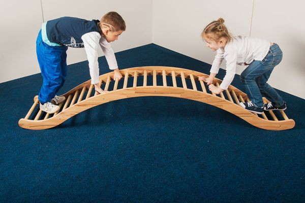 С этой необычной лестницей можно придумать много занятий - сидеть, стоять, лежать, качаться на ней одному или вдвоем. Установив ее как мост, дети могут ползать под ней или ходить и бегать по верху. Шагая по удобным, круглым рейкам босиком, ребенок укрепляет стопы. Благодаря небольшому весу лестница удобна в транспортировке. Материал - бук