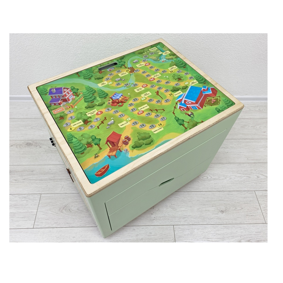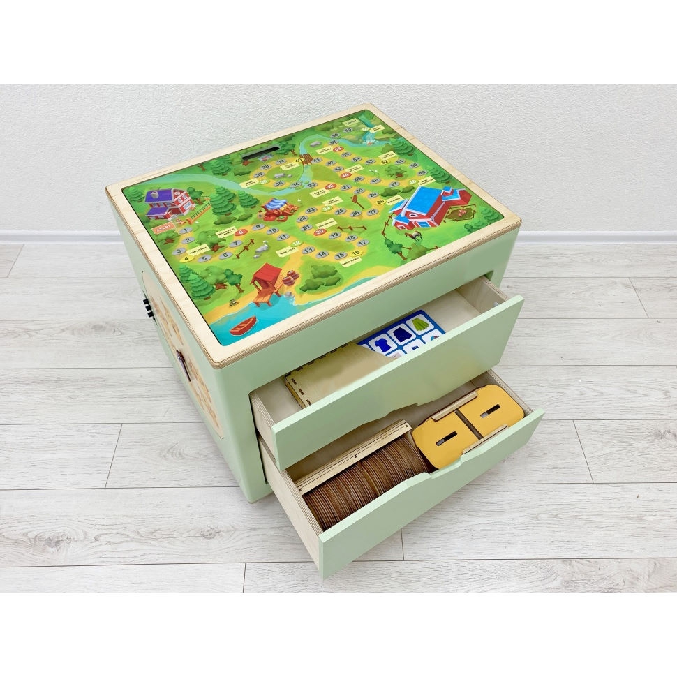 Мобильный куб на колёсиках может передвигаться в любое место класса, где детям удобнее заниматься, по бокам он оформлен бизибордами «Колесо настроения» и «Времена года», а сверху на крышке – красочная пошаговая игра-бродилка с вопросами на английском. Внутри в удобных ящиках спрятались: дидактические карточки, игра «Дубль», сортеры, пазлы, лото, домино, книга First Book.