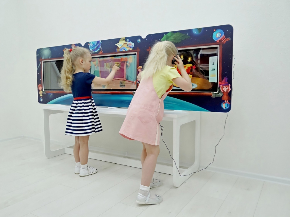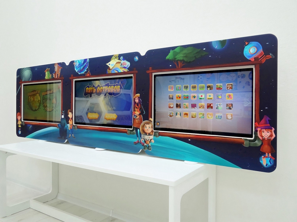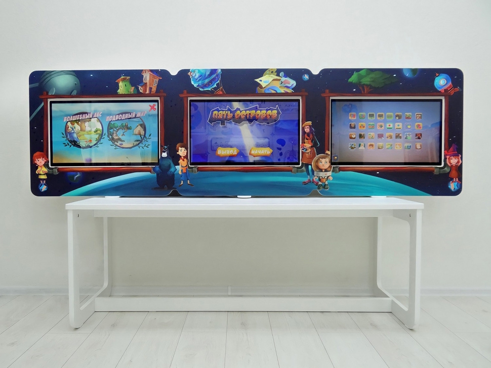 Благодаря трём расположенным рядом сенсорным панелям дети могут запустить одно и то же занятие и ориентироваться не только на свой, но и на чужой результат. А если детям нравятся разные игры, это тоже возможно.