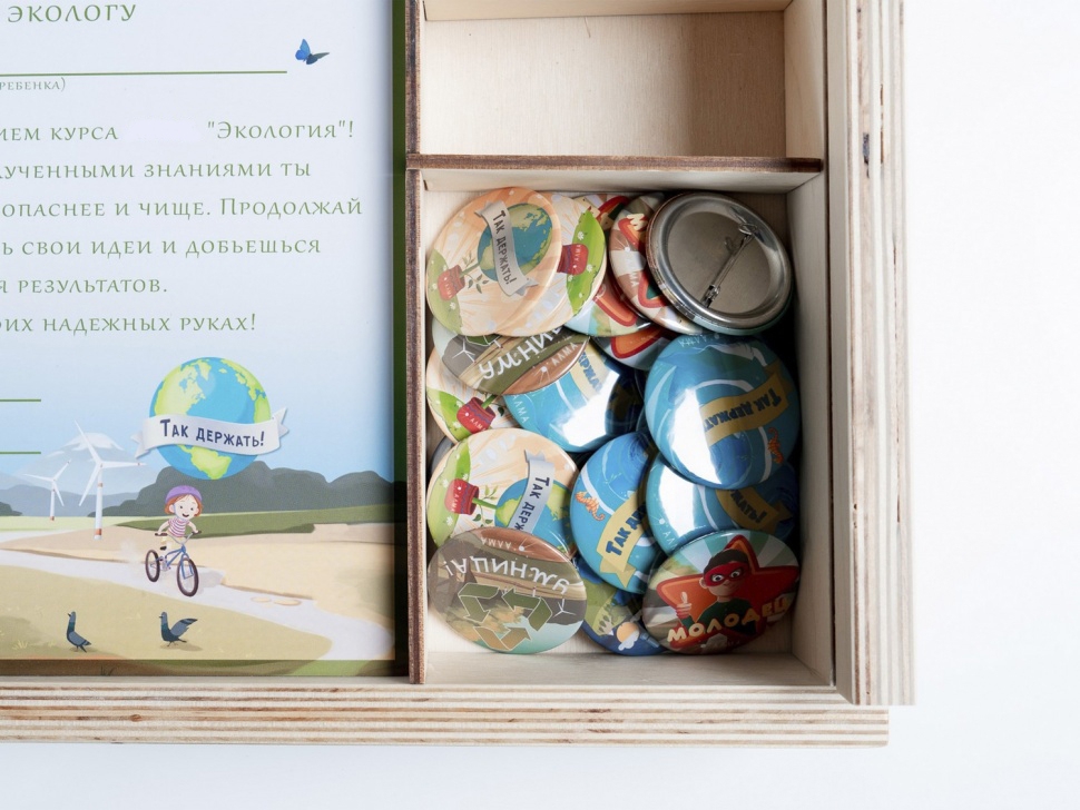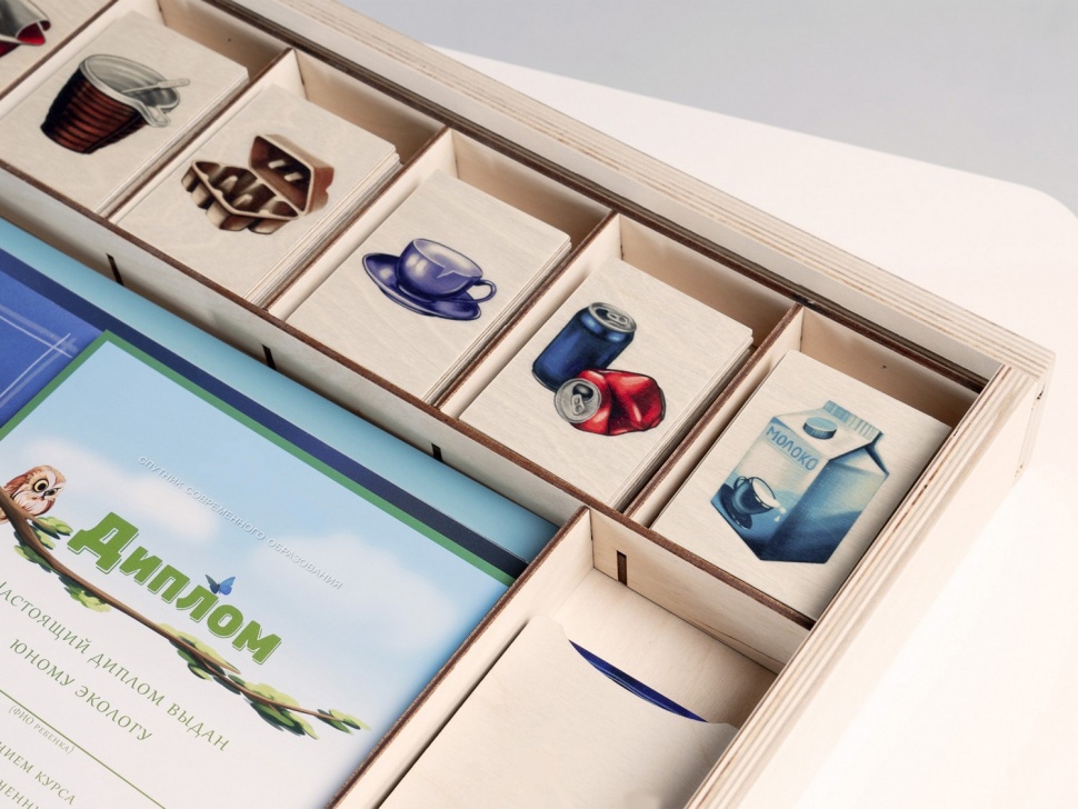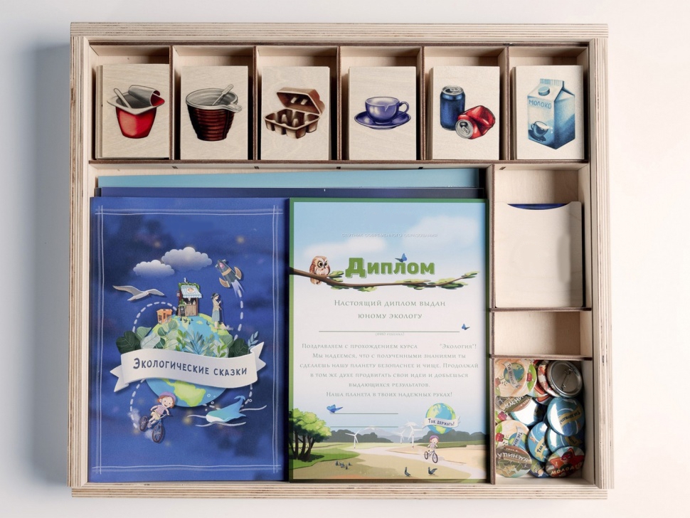 «Экология» — это программное обеспечение, мотивационные значки и дипломы «Юного эколога», сборник экологических авторских сказок, тематические плакаты, комплект деревянных контейнеров и игральных карточек для «сортировки мусора», карточки для проведения викторины.
