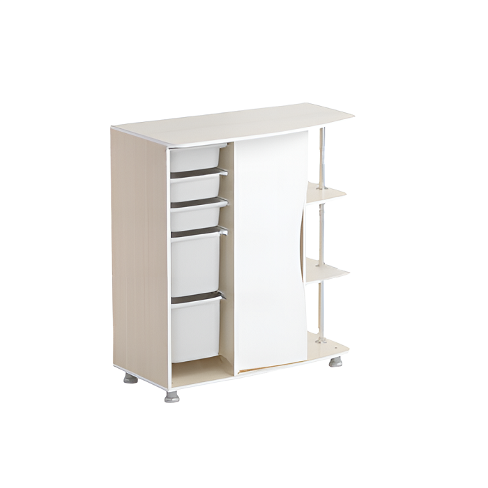 Стеллаж правый Робик 001 выполнен из ламинированной ДСП 16 мм, края обрамлены кантом ПВХ 2 мм. Стеллаж пространственно разделён на три вертикальных секции.