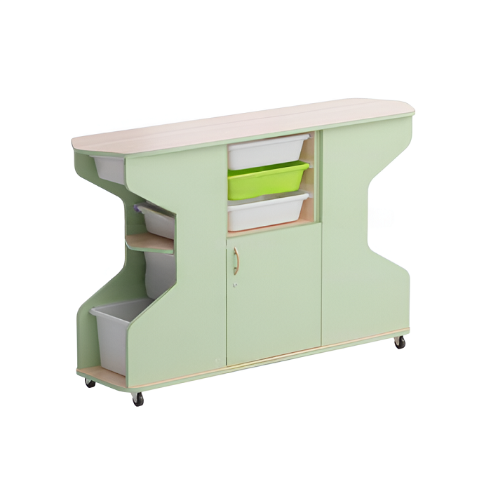 Верхняя часть открыта с передней и задней стороны, нижняя часть и с передней и с задней стороны закрыта дверками с мебельными замками.