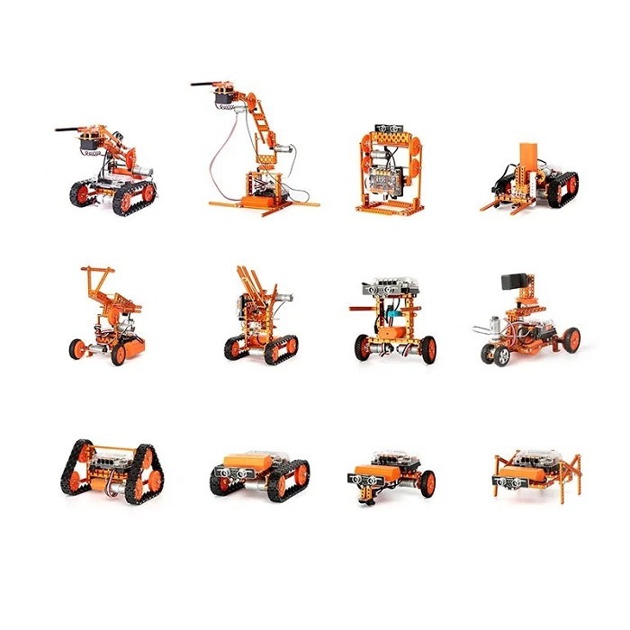 Набор содержит металлические конструктивные детали, пластиковые детали, электронные модули, инструменты, с помощью которых можно создать более 12 различных типов роботов.