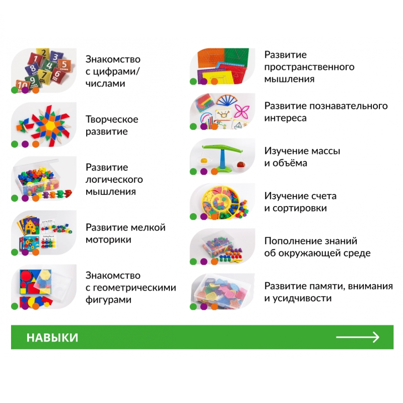 Комплект состоит из многофункциональных пособий, которые помимо математических навыков выполняют также и ряд других функций: