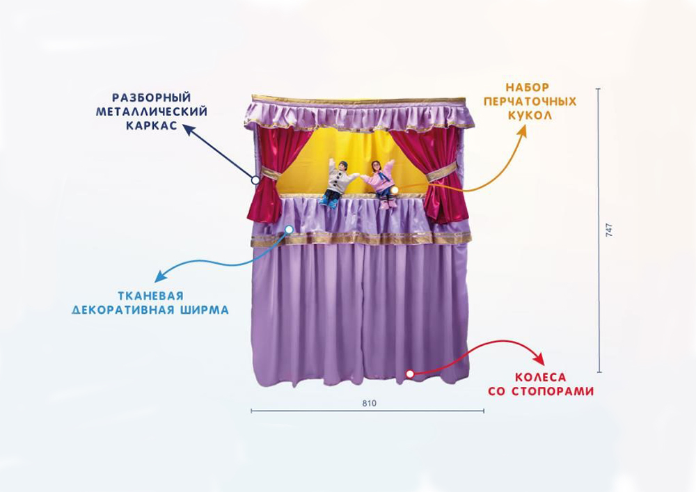 Кукольный театр «В гостях у сказки» был разработан, скомплектован и произведен методистами. Главным предназначением кукольного театра является организация театральных постановок при помощи перчаточных кукол.