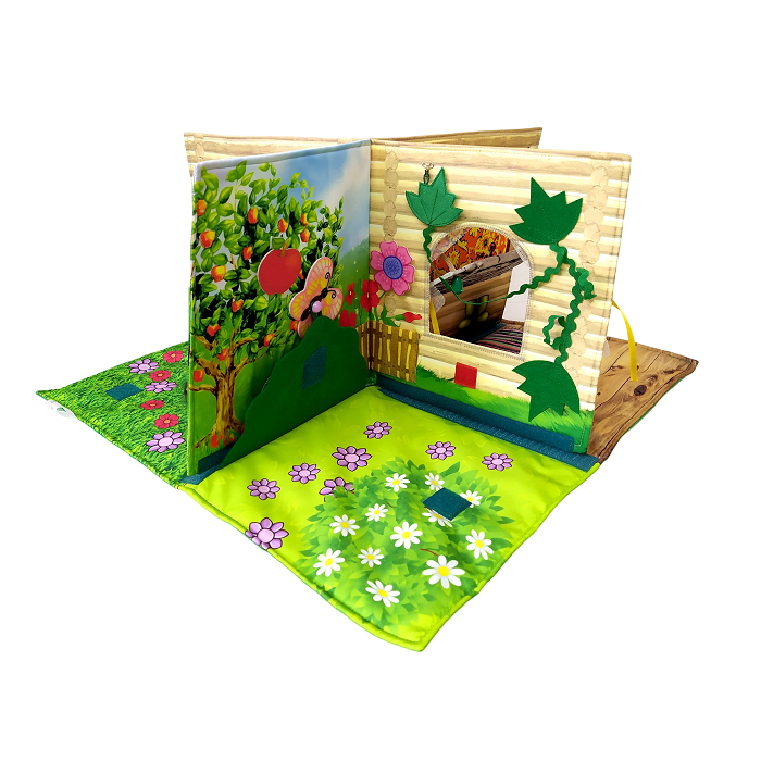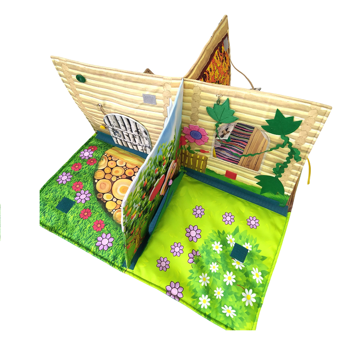 Разделена на 4 зоны: кухня с печкой, комната с окошком и полатями, садик перед домом с лужайкой и забором, лес с деревьями. Все это дополнено навесными элементами (тучка, птичка, бабочка, куст, цветочек) для более интересной игры.