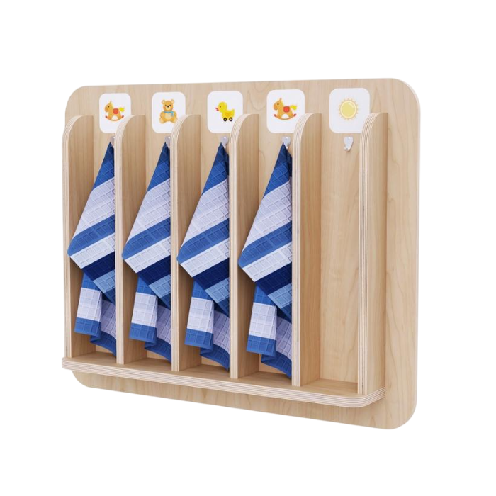 Дизайн вешалки разработан с учетом детских предпочтений и психологических особенностей, что делает её не только полезным, но и любимым предметом в группе. Вешалка оборудована специальными крючками, размещенными на удобной для детей высоте, обеспечивая легкий доступ к полотенцам.