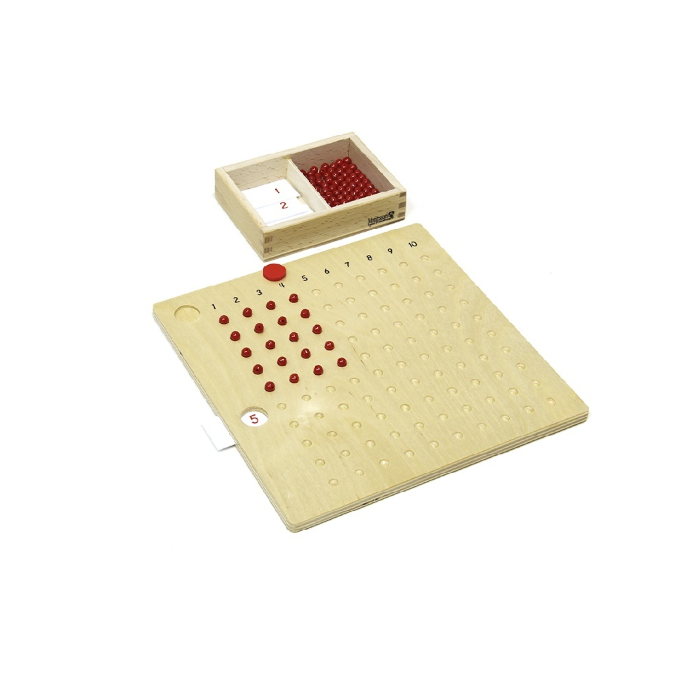 Доска предназначена для упражнений в умножении  чисел от «одиножды один»  до «десятью десять». С помощью простых наглядных материалов ребёнок многократно повторяет умножение одного и того же числа на разные множители от 1 до 10, запоминая тем самым таблицу умножения. Выложенные на доске бусины наглядно демонстрируют геометрическую интерпретацию произведения 2-х чисел, как прямоугольника.