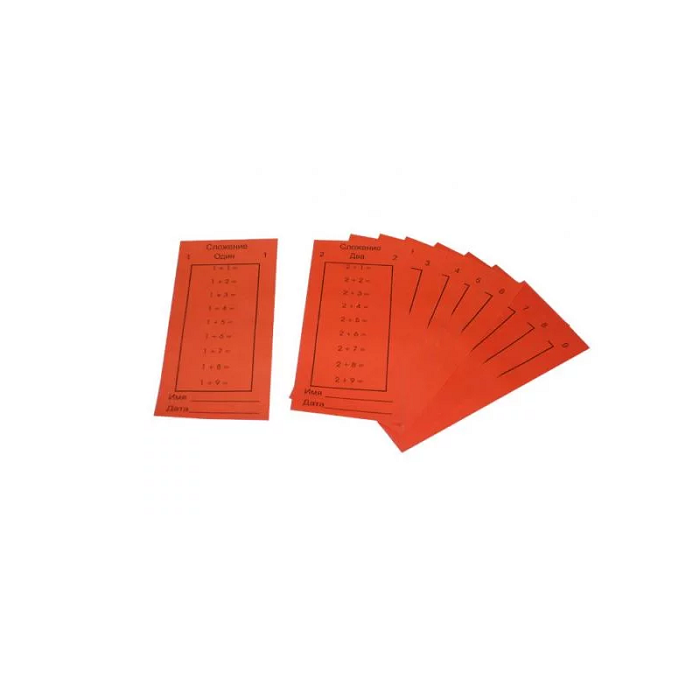 Материал представляет собой бумажные карточки красного цвета с примерами на сложение, по 20 карточек на каждый пример.