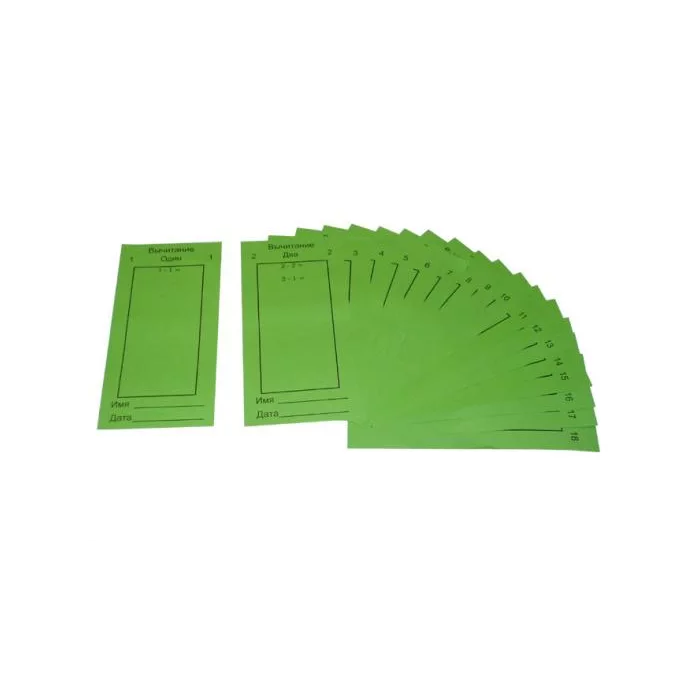 Материал представляет собой бумажные карточки зелёного цвета с примерами на вычитание, по 20 карточек на каждый пример.