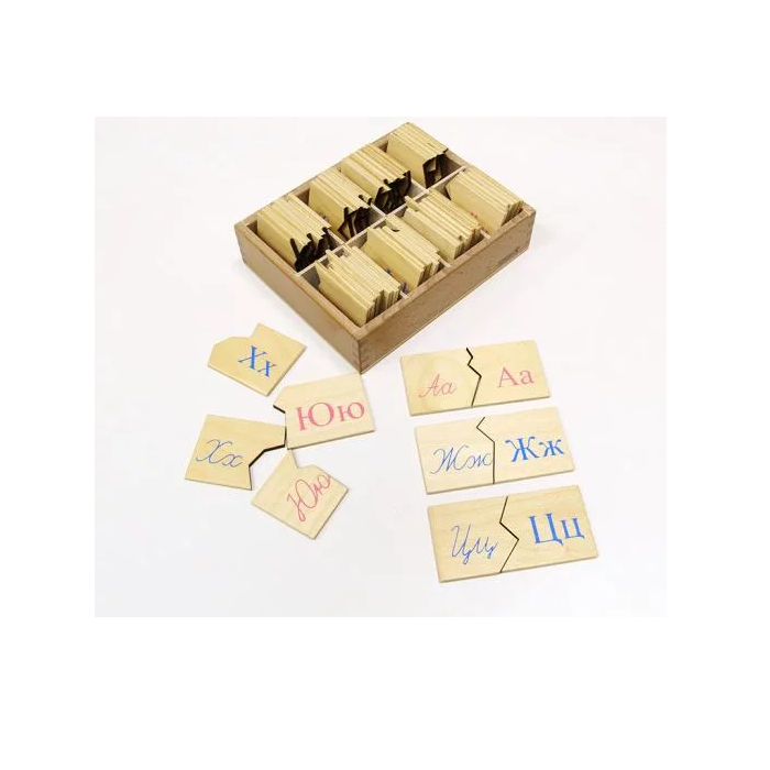 В деревянной коробочке с отделениями находятся 33 таблички с письменными буквами русского алфавита и соответствующие им 33 таблички с печатными буквами. По 2 буквы на каждой табличке: заглавная и строчная. Все таблички выполнены в виде пазлов.