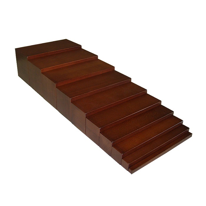 Коричневая лестница – ребенок учится визуально различать площади и объемы при изменении двух измерений при постоянном третьем. Косвенно происходит развитие координации движении, концентрация внимания, подготовка к математике и письму, развивается мускульная память, точность, создается сенсорная база для последующего ознакомления ребенка с понятием «толстый - тонкий».