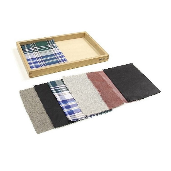Материал развивает осязание. Ребенок составляет пары одинаковых на ощупь тканей. Косвенно происходит развитие мелкой моторики, подготовка к письму, восприятие порядка.