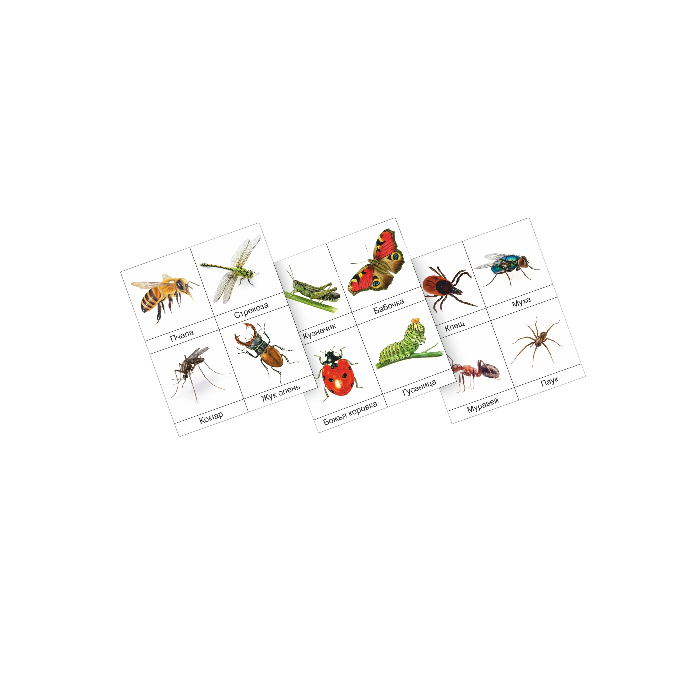 В наборе – гусеница, комар, кузнечик, бабочка, стрекоза, жук, муравей, паук, муха, пчела, божья коровка, клещ. Карточки можно разрезать. Данный набор подходит для работы с игровым полем. Для каждой карточки вложена липучка (лентой Velcro).