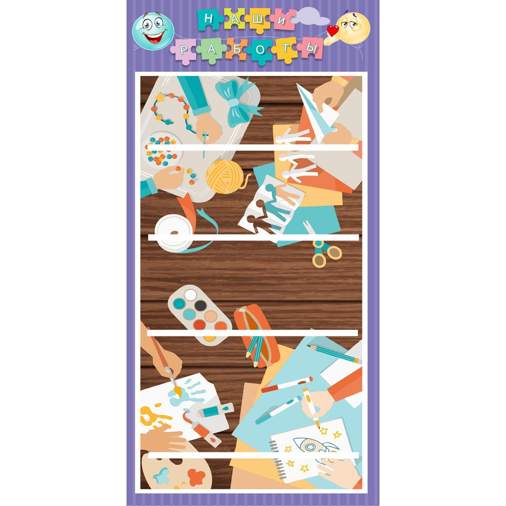 Стенд "Наши работы Рукодельники" имеет очень необычный дизайн. Фоном для полочек, предназначенных для размещения детских работ, служит изображение настоящей мастерской детского творчества на столе. Такая картина может послужить источником новых необычных идей для юных рукодельников.