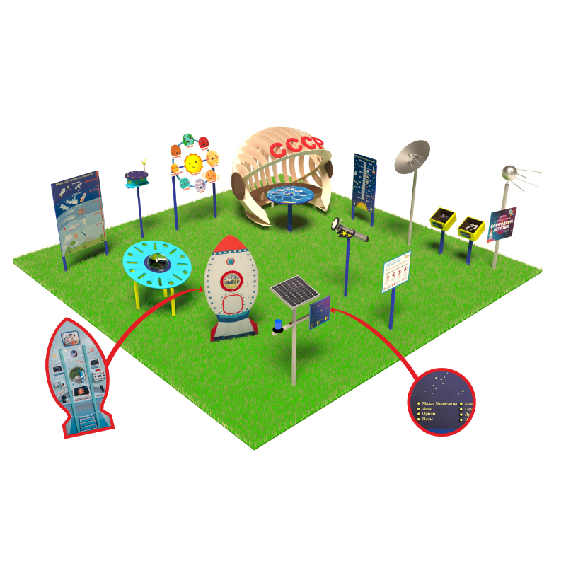 «Детская космическая станция» - это уличный комплекс, в состав которого входят красочные интерактивные стенды и макеты. С их помощью дети осваивают первые азы астрономии.
