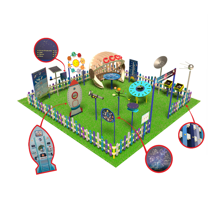 «Детская космическая станция» - это уличный комплекс, в состав которого входят красочные интерактивные стенды и макеты. С их помощью дети осваивают первые азы астрономии.