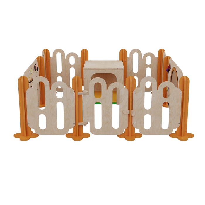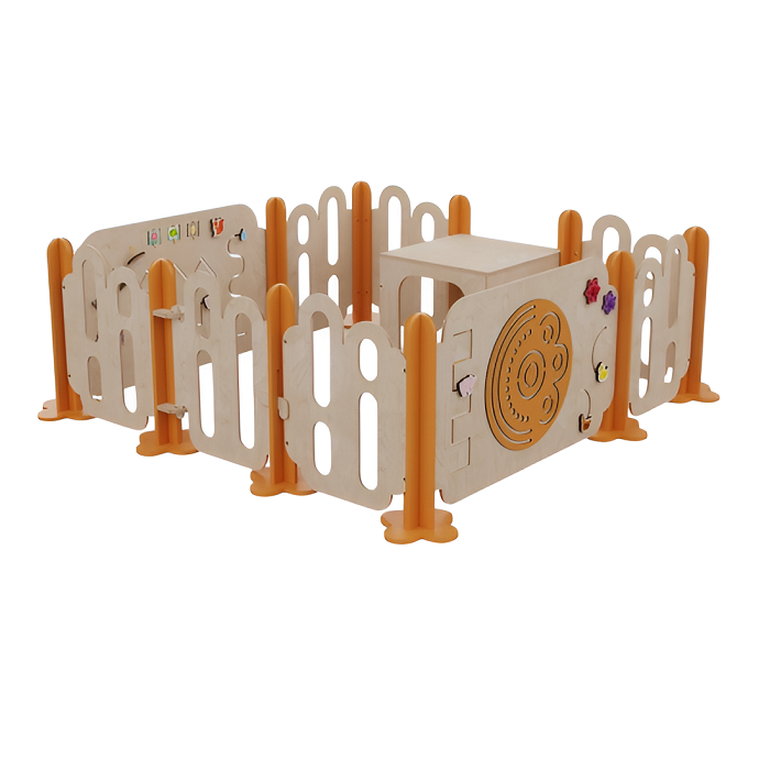 Манеж обеспечивает безопасность малышей, а дополнительные элементы конструкции — куб и бизиборды — расширяют игровое пространство и способствуют развитию координации, моторики и фантазии.
