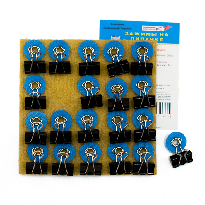 Зажим открывается нажатием на металлические скобы. Дидактический материал (картинки, плакаты, схемы) удерживаются необходимым количеством зажимов на ковролиновой поверхности.