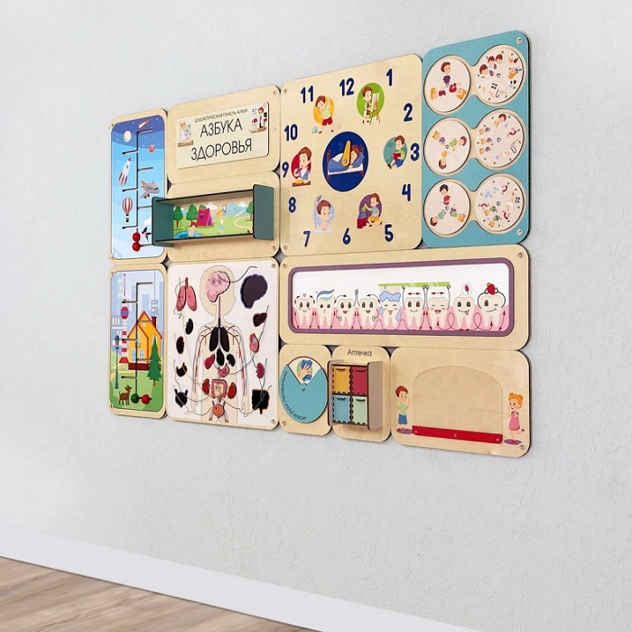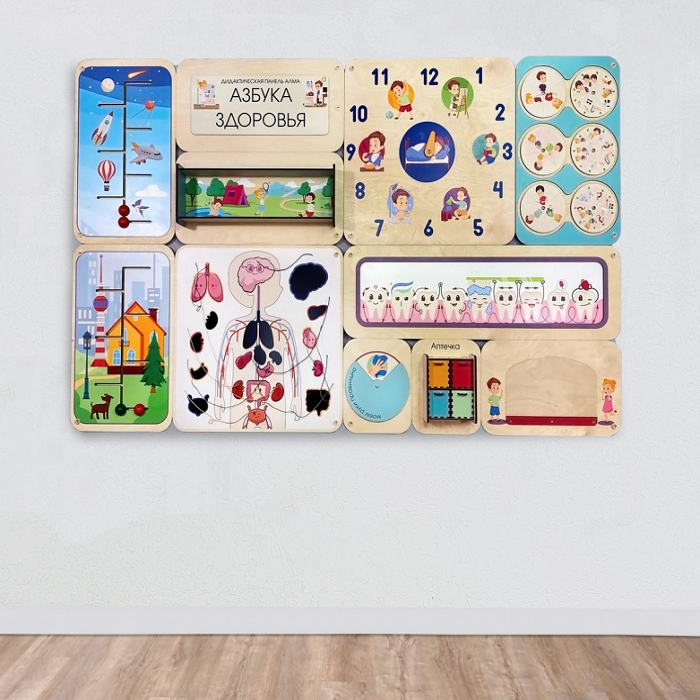 Главная Каталог Подготовительная группа и детский сад Сенсомоторное развитие Сенсорные панели для детей Дидактическая настенная панель «Азбука здоровья»