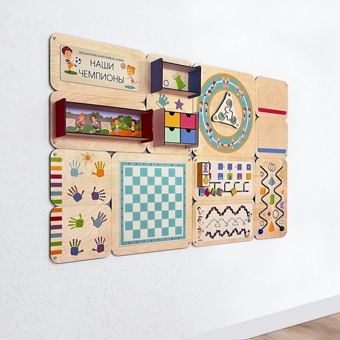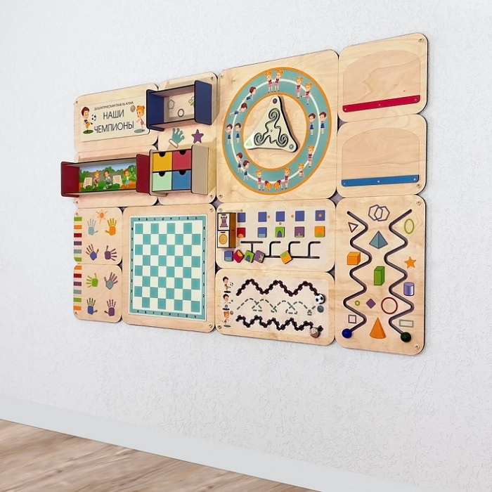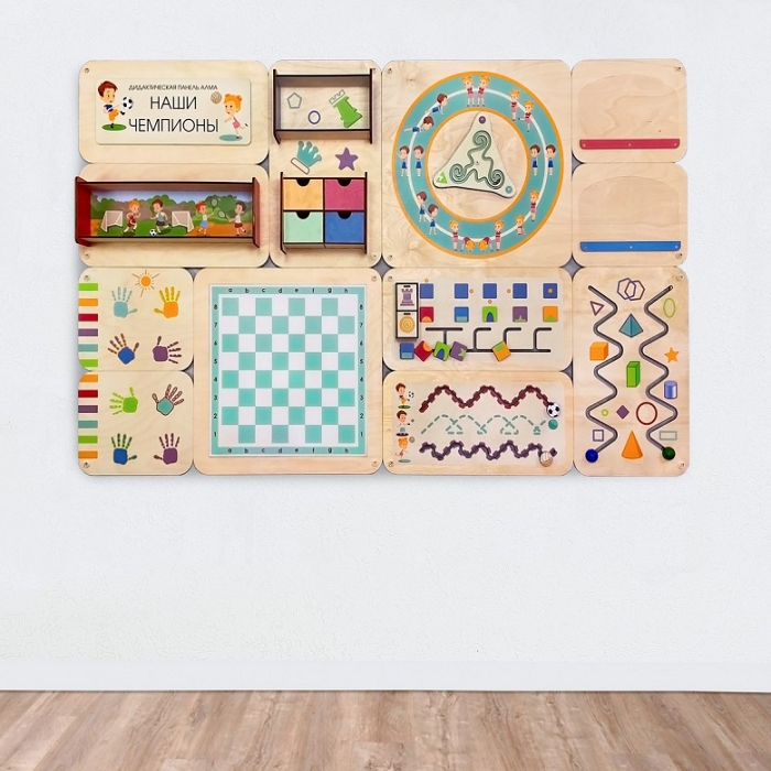 Главная Каталог Подготовительная группа и детский сад Сенсомоторное развитие Сенсорные панели для детей Дидактическая настенная панель «Наши чемпионы»