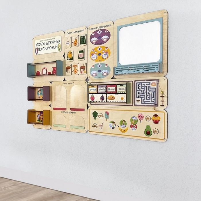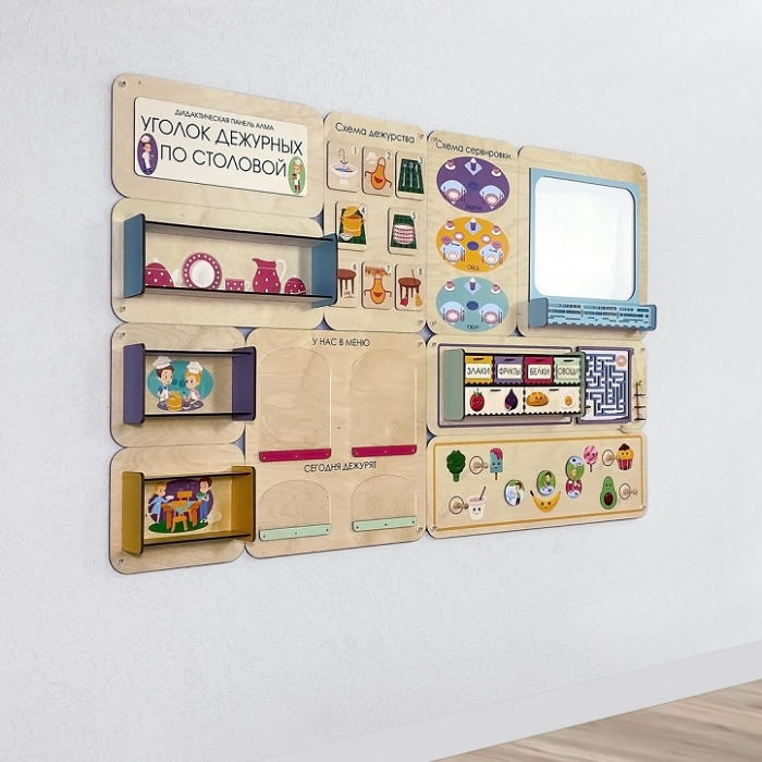 Главная Каталог Подготовительная группа и детский сад Сенсомоторное развитие Сенсорные панели для детей Дидактическая настенная панель «Уголок дежурных по столовой»