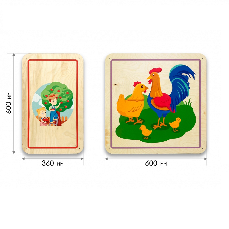 Дополнительные модули бывают однотонные и с тематическими иллюстрациями, подходящими под тематику дидактических панелей. Разнообразие размеров способствует декорированию стен различной конфигурации и масштабов. Параметры варьируются от совсем маленьких модулей 300х300 мм до крупных размеров 600х600 мм.