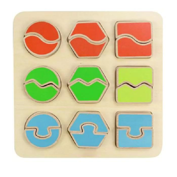 На лицевой стороне панели расположены 9 цветных геометрических фигур, состоящих из 2х половинок в виде пазлов: 3-круга, 3-квадрата и 3- шестиугольника.